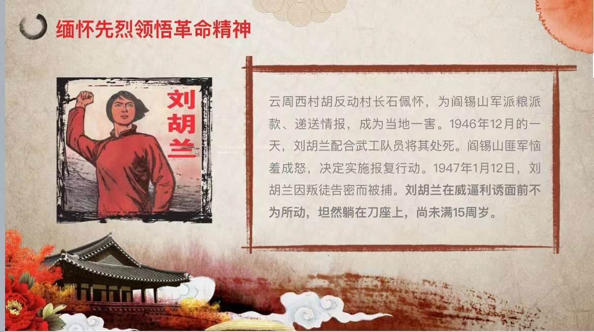 最后,主持人播放了一段革命时代的短片,介绍了邱少云、刘胡兰等革命先烈的伟大事迹,引发同学们的深刻思考和共鸣。