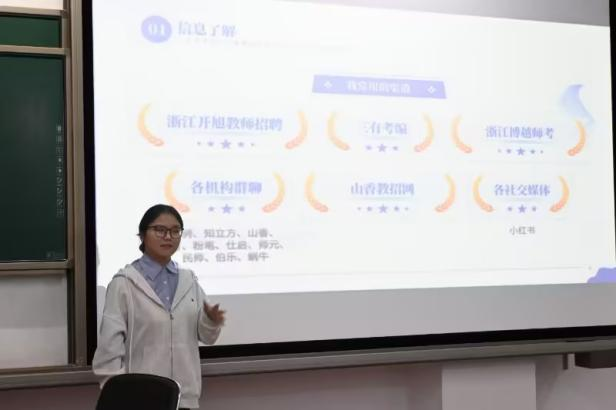 顾秀莲向同学们介绍了考编的相关过程与经验。她首先向同学们了解对于考编准备、技巧和流程的疑虑,然后分别从信息了解、考编规划、教师技能提升以及心态处理等方面为同学们提供了丰富的经验。她送给同学们一句话:“诚能自固如是,是山止川行之势也;以战必胜,以功必取胜也。”,以此激励在座同学接续奋斗。