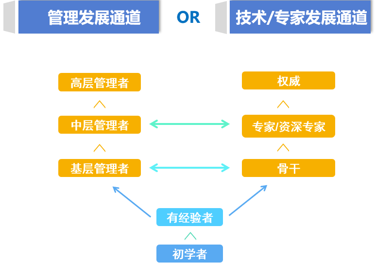 公司为员工提供了双通道发展路径。员工可以根据公司的需要,结合自己的专长和发展意愿选择不同的职业路线,在管理方向或者技术方向发展。